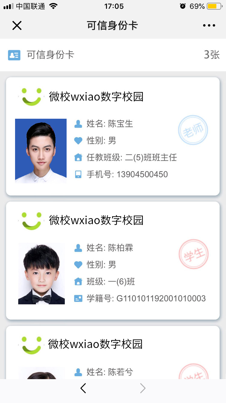 “可信身份卡”应用属于微校wxiao数字校园的校园安全体系,使用对象为老师、家长和访客。通过该应用,老师、家长和访客的身份由学校进行可信认证管理,微信实名身份体系和区块链技术全面保障身份的真实性和有效性