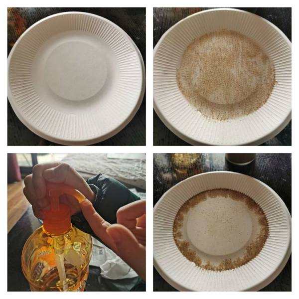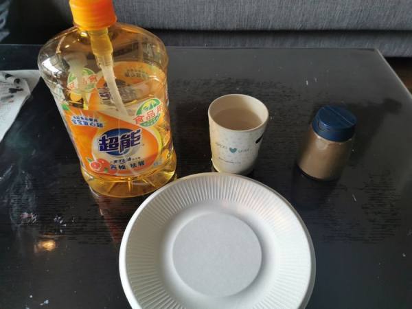 实验材料:胡椒粉、清水、空盘、洗洁精。
